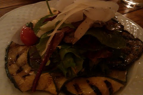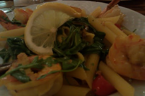Tonight we were up in the San Roque area so we decided to try Via Maestra 42. This is one of those places that you pass a million times. I am so happy that we finally stepped inside. It is a cozy, neighborhoodish restaurant. I started with the Insalata di Franco. It included organic greens, freh mozzarella, tomatoes, grilled zucchini and grilled eggplant. I really liked this salad. I then had GLUTEN-FREE PASTA. At this point, I will be surprised if a place I go to does NOT have GF pasta. The waitress explained that it was a $5.00 charge for the GF pasta. I said that was fine, and ordered the pasta with shrimp, cherry tomatoes and arugula.
