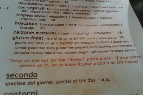 Tonight we went to Olio Pizzeria because gluten-free pizza sounded fantastic for dinner. Last time we were there, they were able to make any of the pizzas gluten-free (but gluten-free crusts were not mentioned on the menu). This time, however, I found a change to the menu as shown above. It seemed interesting to me, so I asked our waitress about the change but she was under the impression that it had always been like this. Hmm. We ended up starting with the caponatina con burrata which was burrata cheese with sicilian ratatouille.