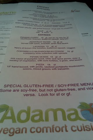 Adama is one of those places that we have been meaning to try. My husband is a vegetarian and I have heard that they are GF Friendly. We always put it off for places that have cheesy items instead though. Tonight, we finally tried it and were pleasantly surprised. When I started asking GF questions, the waitress brought back a gluten-free labeled menu as shown above. We started with the Fritto Misto and the Sweet Potato Fries with Chipotle Aioli.