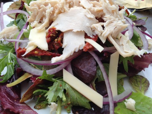 My celiac friend and I spent the day exploring Summerland and the antique shops that line Lillie Avenue. When hunger struck, we stopped at Cafe Luna to get some food. They do not have GF bread, but they will make any of their sandwiches into a salad. I had the turkey sandwich as a salad. It came with cheese, sun dried tomatoes and onions with a balsamic vinaigrette.