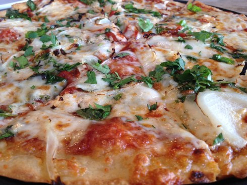 This delicious looking pizza was thanks to Pizza Guru on Saturday night. We ordered the Guru Special with no chicken and no hemp seeds. It had pizza sauce, spinach, roasted garlic, onions, mozzarella and fresh cilantro. The medium sized gluten-free pizza is the perfect size for two people to share.