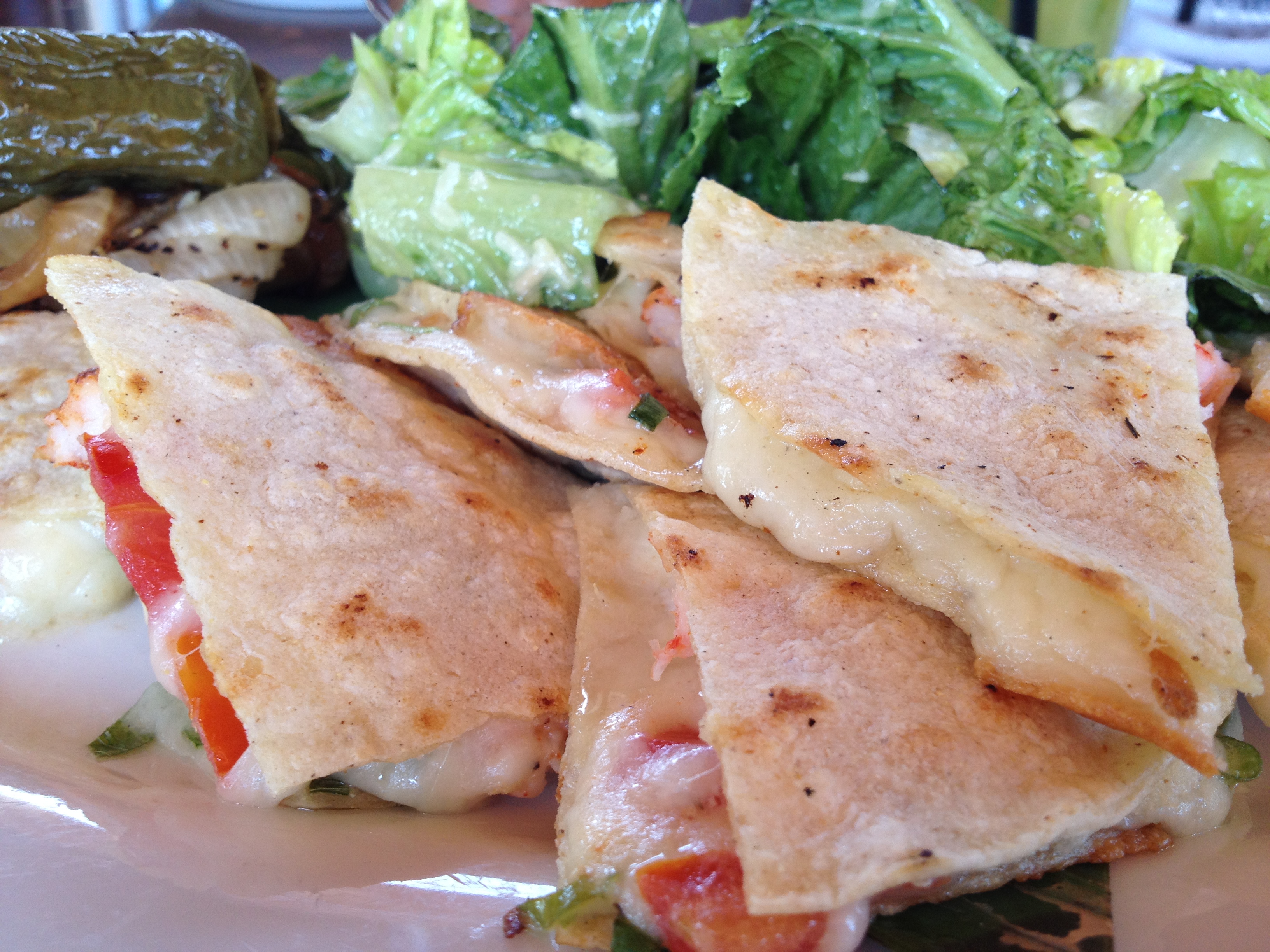 One of my favorite things to do is to be a tourist in my own town. So, this morning, a friend and I spent about two hours exploring Santa Barbara on a Segway while learning a few interesting things along the way. All of this exploring made us quite hungry… especially after passing some of our favorite eateries. After we were done, we headed over to Boathouse to grab some lunch. I had the Blackened Shrimp Quesadilla which was served with caesar salad and grilled onions.