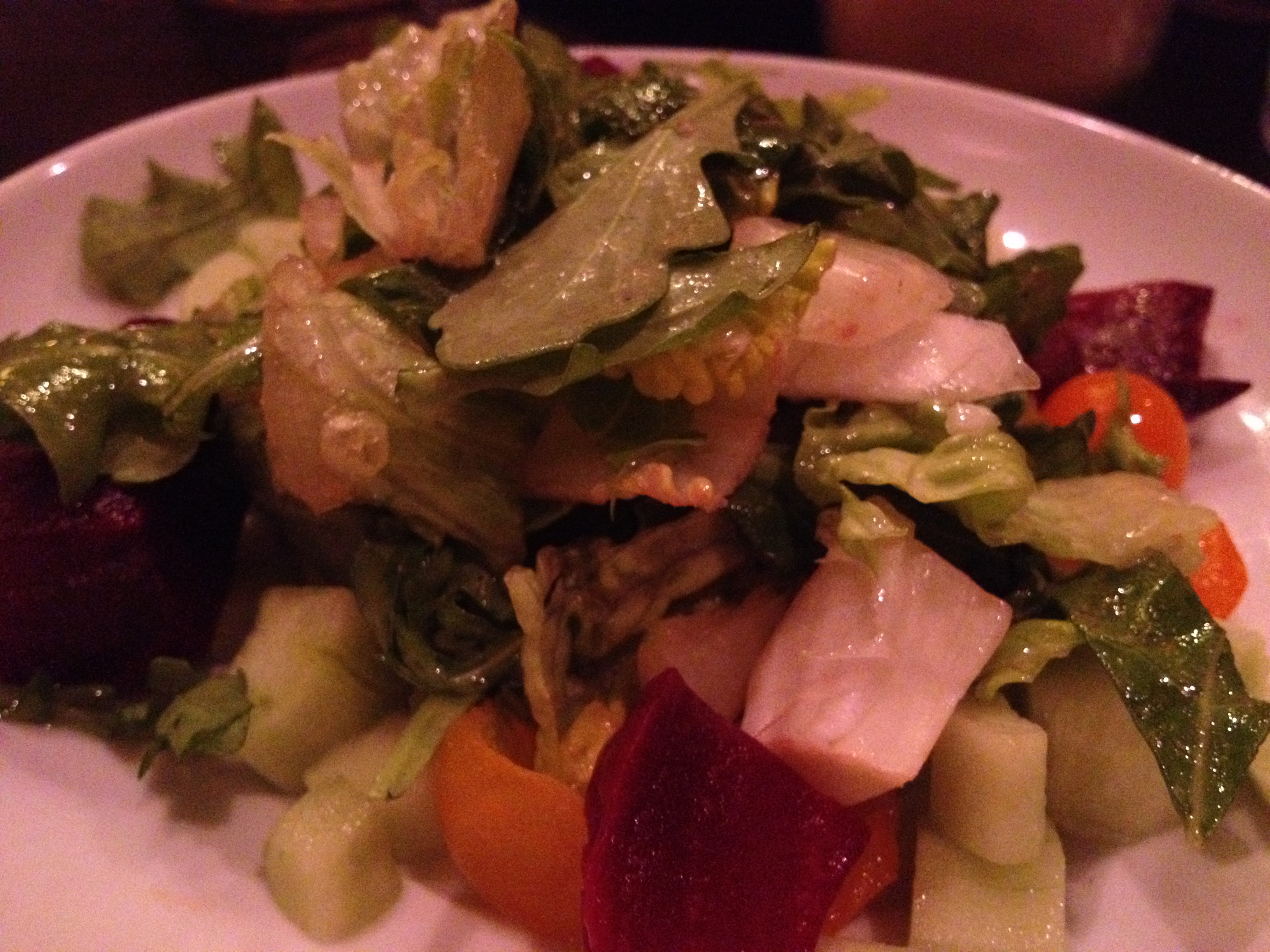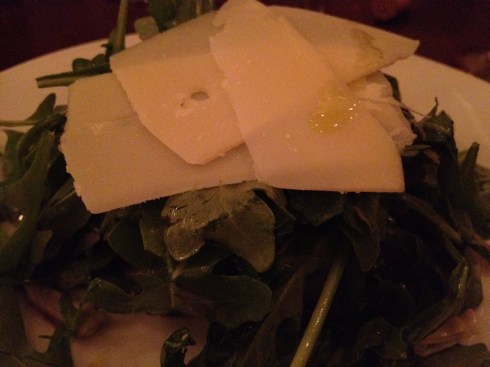 After our waiter assured me that there were no breadcrumbs in the preparation of this dish, I dug in. I am such a sucker for dishes that are gooey and cheesy. I then had the arugula salad which was prepared with artichokes and shaved Parmesan.
