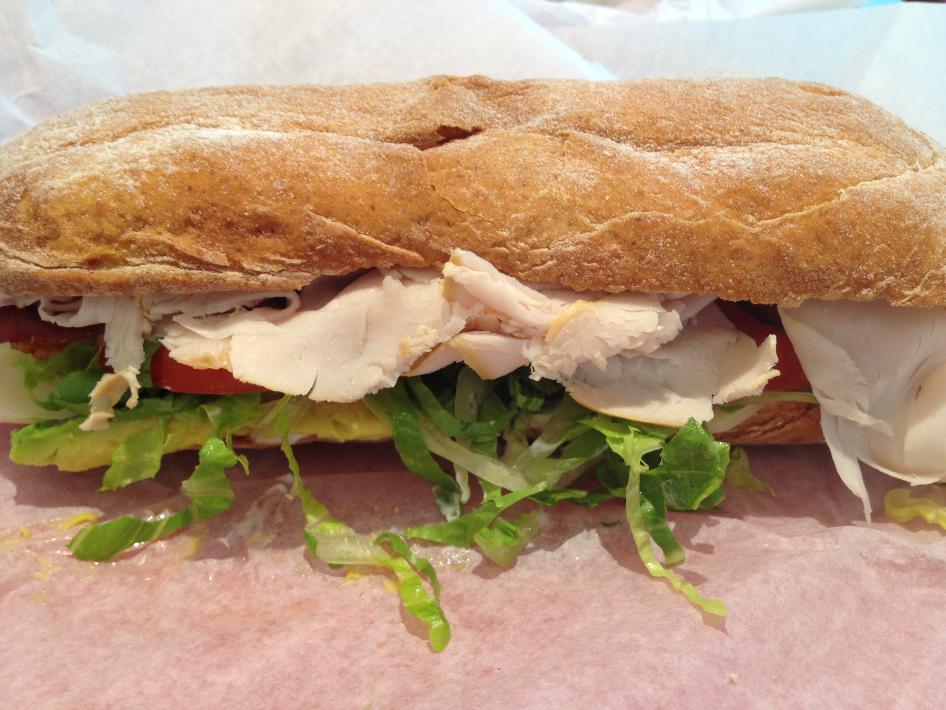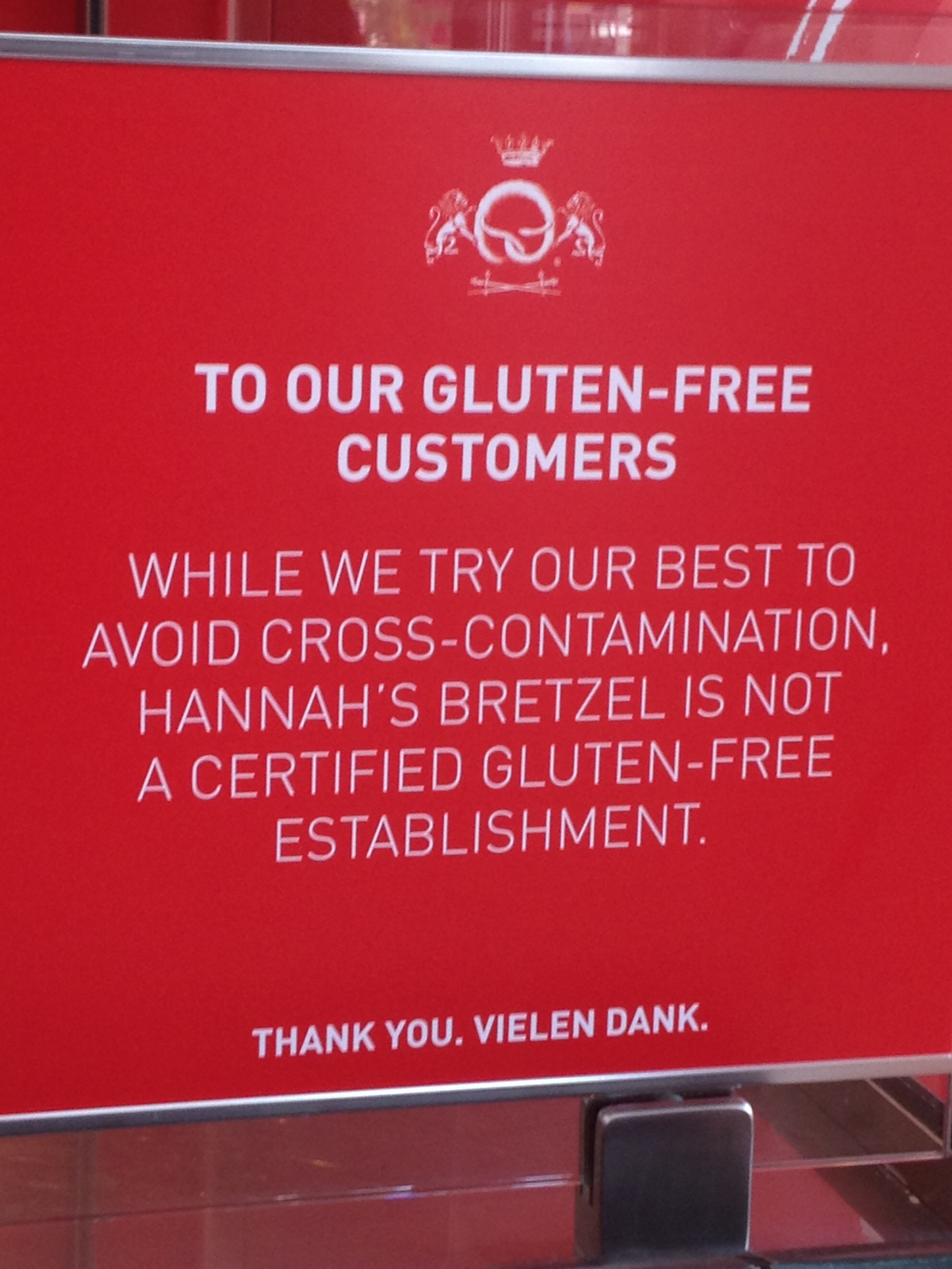 Some Celiacs may see a sign like that and run the other way. I did the opposite. I asked a bunch of questions. I found that Hannah’s Bretzel in Chicago did a great job of preventing cross contamination when making my GF sandwich. A chosen staff member went to put on a different color of gloves, and then went to a separate area where the GF baguettes were individually wrapped. He then used a special knife kept in that area that had been wrapped up when not in use. The end product was Hannah’s Club on a gluten-free baguette.