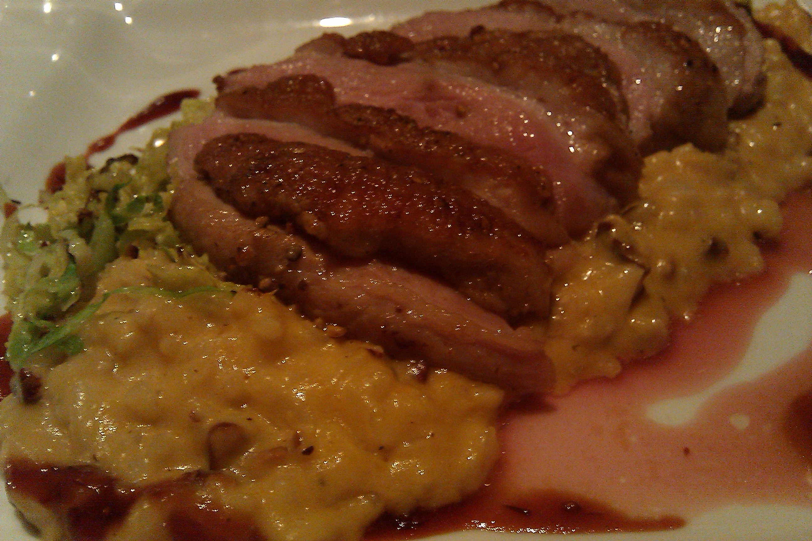 This was served with butternut squash, pecan risotto, brussels sprouts, cranberry and a molasses glaze. Consider me a duck fan.